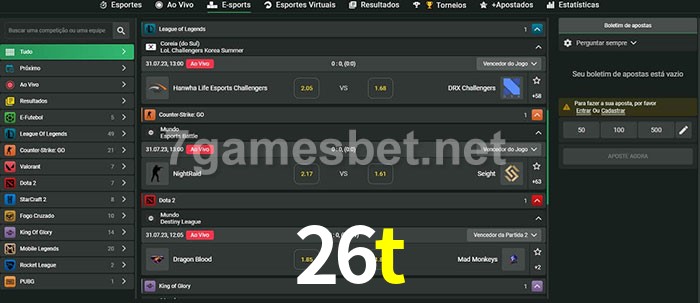 O 26t oferece uma grande seleção de opções de apostas em e-sports com probabilidades competitivas